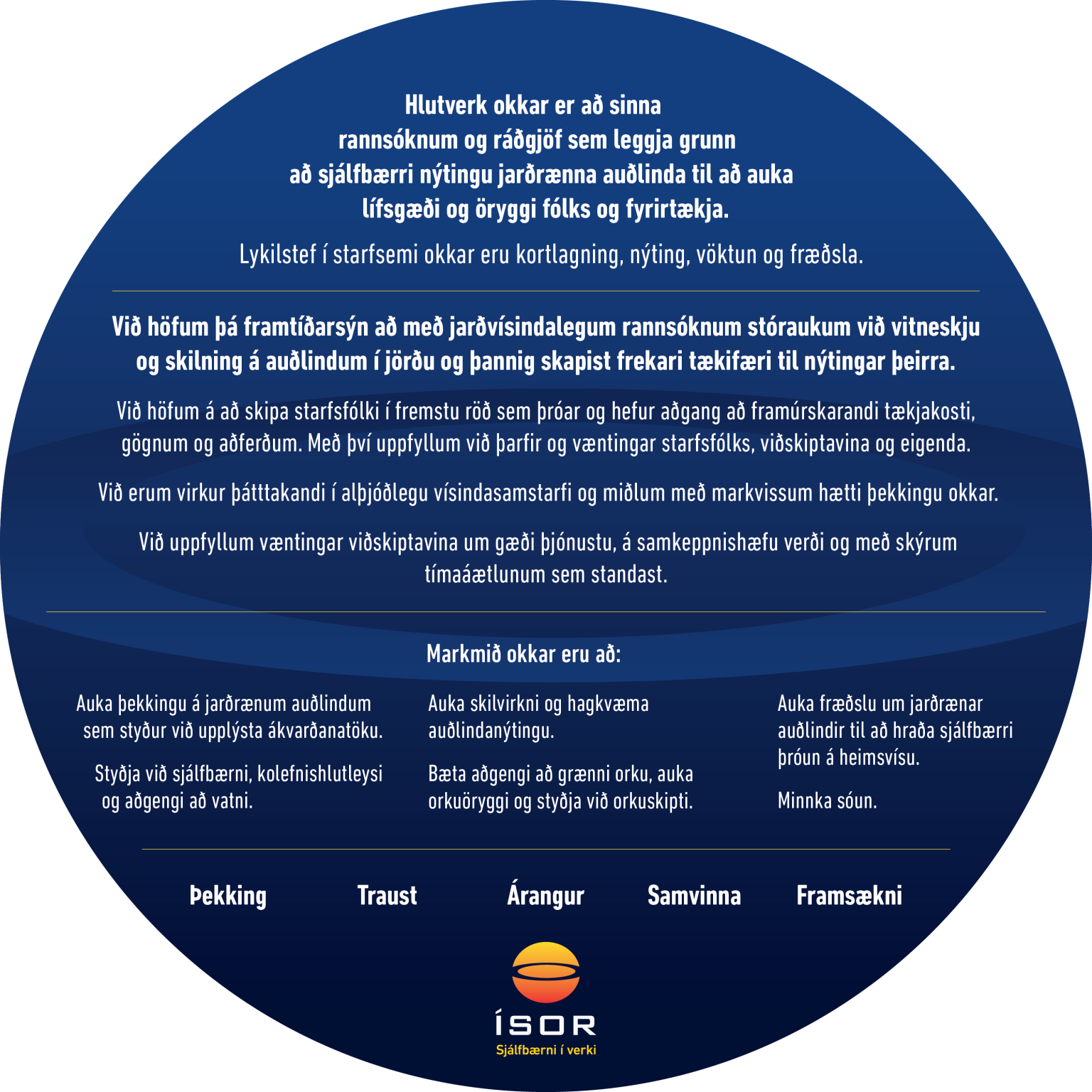 Metnaður ÍSOR er að vera leiðandi í ráðgjöf á heimsvísu á sviði sjálfbærrar nýtingar jarðrænna auðlinda og styðja kröftuglega við stefnu og áherslur Íslands í umhverfis-, auðlinda- og orkumálum innanlands og í alþjóðlegu samstarfi.